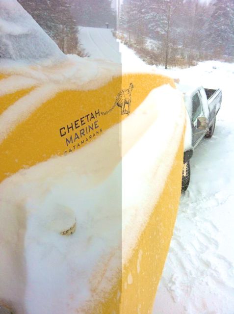 Le Poisson Clown arrived in Halifax in February. Alex’s next task wasto complete the fit out in subzero temperatures in a polytunnel near his home.With daytime temperatures regularly dropping below -10 and the start of the2014 season looming this was quite an accomplishment!