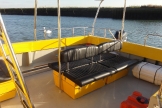 Once in Sierra Leone, the 11.2m will be transferring groups of 15 between Lungi International Airport and the capital of Freetown which is a 15 mile stretch across the Estuary. The 11.2m has a good carrying capacity and has been fitted out with 11 KAB suspension seats in the large wheelhouse and 10 seats in the cockpit. To keep guests cool in the sweltering 35 degree average temperature, an air con unit has been housed on the flybridge which is powered by a 2Kva Honda generator. A comprehensive electronics package includes the Garmin GPS Map 4000/5000 and GMRHD Radome.