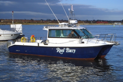 With a large stable deck, ‘Reel Busy’ makes an excellent fishing platform. 11 rod holders are fitted in the gunwales and to the wheelhouse overhang. Twin 225hp Honda outboards are fitted to moulded engine pods behind the transom. A 200litre bait storage tank has been fitted into the space between the engines leaving the deck clear for fishing. Stewart specified an additional echosounder transducer and waterproof display screen. Both have been fitted at the stern of the craft enabling Stewart to check depths when drifting over wrecks and shallows without having to go back into the wheelhouse.